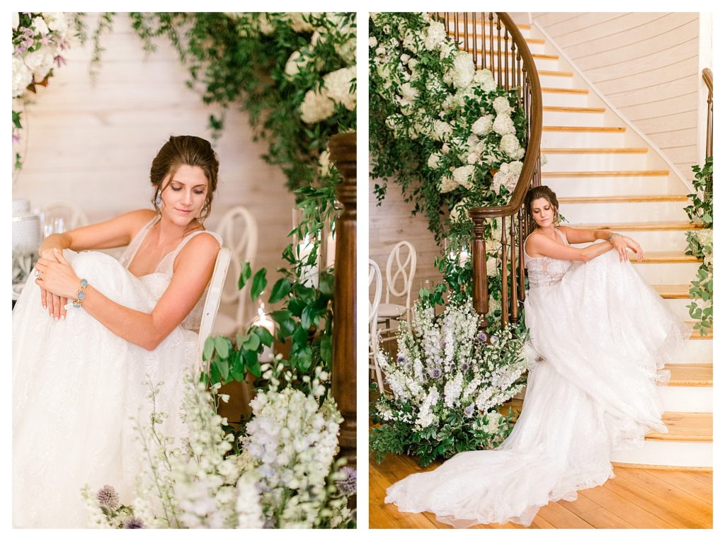 Classic. Elegant. Timeless….These are the words that come to mind when I think of the gorgeous florals that the team from Petal and Oak put together for their editorial in the current issue of Heart of NC Weddings magazine. This past summer, Joseph Barnes and his team put together this stunning work of art at the Historic Wakefield Barn in Raleigh, NC. Inspired by the wonder and romance of a garden wedding, they used full blooms of hydrangeas and an abundance of simple greenery to create this epic staircase, which serves as an enchanting backdrop to any wedding. Below the cascading florals is a guest table set in deep shades of velvety blue, candlelight, white roses, succulents, and beautiful china in patterns of blue and white.